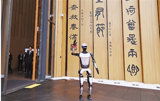 4月13日,人形机器人在中国馆外向嘉宾招手致意。