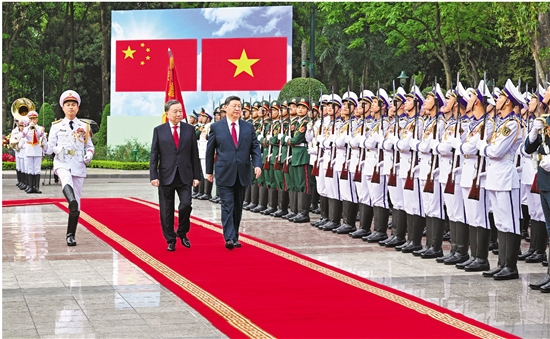 4月14日,中共中央总书记、国家主席习近平抵达河内对越南进行国事访问。当日下午,越共中央总书记苏林为习近平举行隆重欢迎仪式。这是习近平在苏林陪同下检阅仪仗队。 新华社记者 李学仁 摄