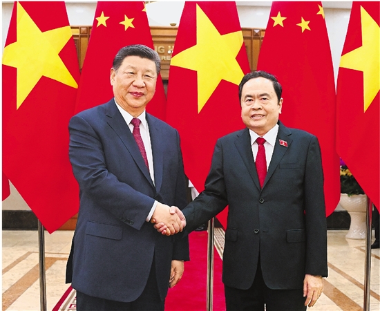 4月14日晚,国家主席习近平在越共中央驻地会见越南国会主席陈青敏。