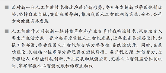 ■ 人工智能作为引领新一轮科技革命和产业变革的战略性技术,深刻改变人类生产生活方式。党中央高度重视人工智能发展,近年来完善顶层设计、加强工作部署,推动我国人工智能综合实力整体性、系统性跃升。同时,在基础理论、关键核心技术等方面还存在短板弱项。要正视差距、加倍努力,全面推进人工智能科技创新、产业发展和赋能应用,完善人工智能监管体制机制,牢牢掌握人工智能发展和治理主动权