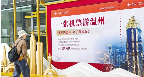 设在温州机场的“一张机票游温州”宣传海报。 本报记者 周琳子 摄