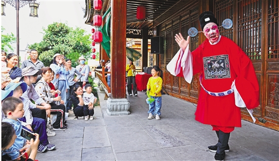 5月1日,在义乌市千年古镇佛堂,中外游客正在观摩婺剧的华彩戏腔,体验“孝义传家·清廉守正”沉浸式文化剧场演出。 通讯员 吕斌 摄