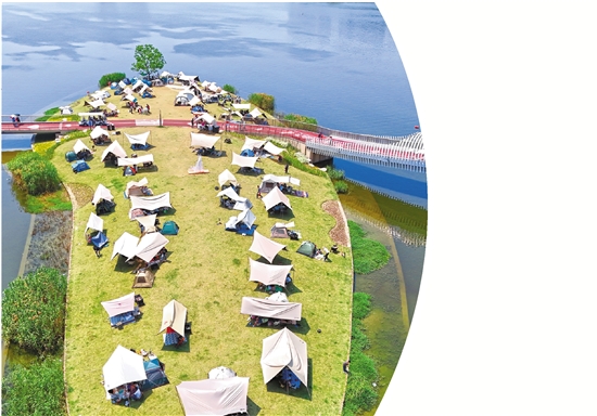 5月2日,杭州东沙湖公园吸引大量市民前来游玩露营。图为市民在湖边搭起天幕,享受假日好天气。 本报记者 吕之遥 摄