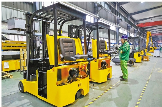 如意公司的工人在调试叉车