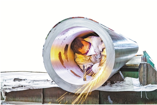 位于上虞区小越街道的浙江泰富无缝钢管有限公司,工人正在对一根无缝钢管进行内壁打磨。