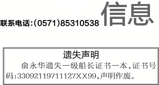 俞永华遗失一级船长证书一本,证书号码:33092119711127XX99,声明作废。