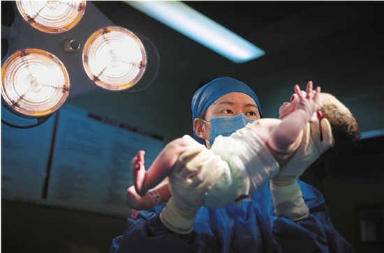 无影灯下,浙江省立同德医院的护士托起新生儿仔细察看。 本报记者 倪雁强 拍友 何畅 摄