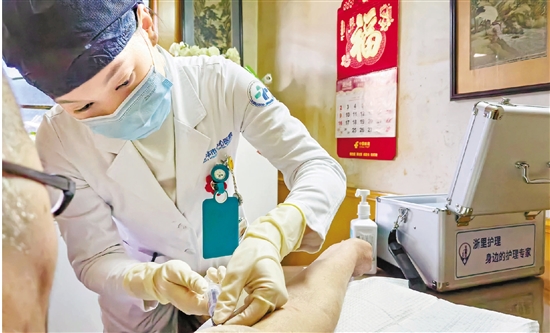 金华市中心医院的“网约护士”来到腿脚不便的患者家中为其进行护理。
