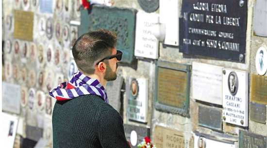 一名男子在奥地利毛特豪森集中营纪念馆观看一面纪念墙。