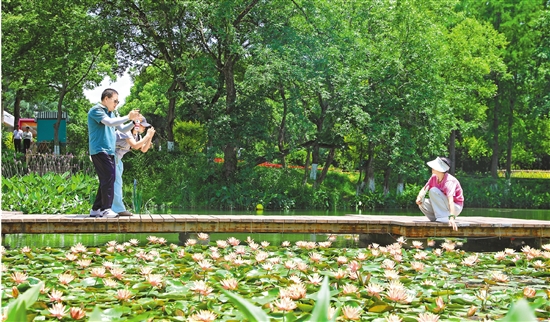 5月13日,夏日的杭州西溪湿地,成片的睡莲绽放,吸引不少市民和游人前来打卡。
