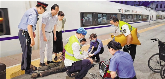 众人在站台抢救病人。 通讯员 朱勇刚 摄