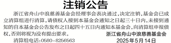 浙江省舟山中浪慈善基金会经理事会表决通过,决定注销,基金会已成立清算组进行清算,请债权人接到本基金会通知之日起三十日内,未接到通知的自本基金会公告发布之日起四十五日内通知本基金会,向清算组申报债权,否则将视为没有提出要求。