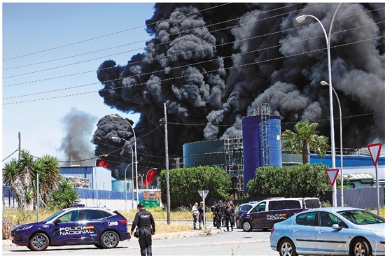 西班牙南部小城瓜代拉堡一处化学品仓库14日起火爆炸,现场浓烟滚滚。有关部门向近8万居民发出“居家令”,要求人们留在室内。 新华社发