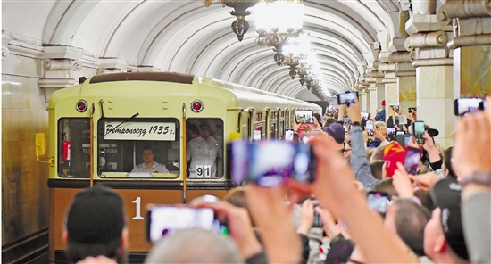 俄罗斯首都莫斯科17日举办复古列车巡游活动,庆祝地铁开通90周年。 新华社发