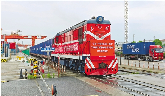 5月18日,采用“铁海快线+中东快航”物流模式的班列从铁路义乌西站开出。