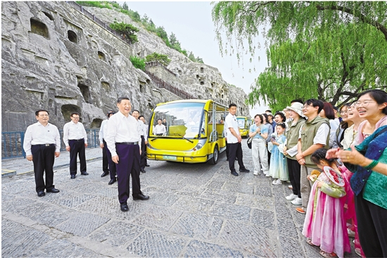 5月19日至20日,中共中央总书记、国家主席、中央军委主席习近平在河南考察。这是19日下午,习近平在洛阳龙门石窟考察时,同游客亲切交流。 新华社记者 谢环驰 摄