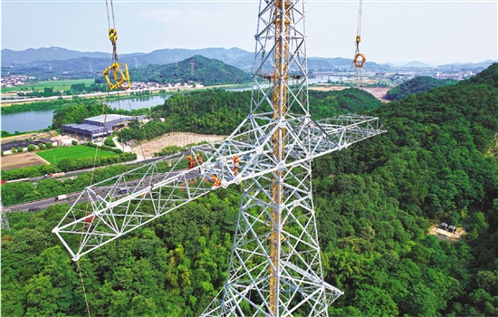 5月30日,随着摇臂精准吊装最后一根横担就位,甘肃—浙江±800千伏特高压直流输电线路工程浙江段首基铁塔组立完成,标志着该工程全面进入杆塔组立阶段。该工程起于甘肃省武威市,终于浙江省绍兴市,线路途经甘肃、宁夏、陕西、河南、安徽、浙江六省区,全长约2370千米,是世界首个柔性直流特高压输电工程。工程建成后,将把甘肃的风电、光伏、煤电等能源送入浙江,有力推动“沙戈荒”能源基地电力外送、支撑浙江新型电力系统建设和能源保供稳价。 本报记者 胡静漪 通讯员 陈子文 胡飞达 陈雨佳 文/摄 |