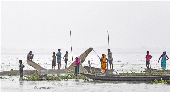6月4日,在印度阿萨姆邦马里冈,人们站在一处水淹的地区。近日,印度部分地区遭遇洪水侵袭。 新华社发