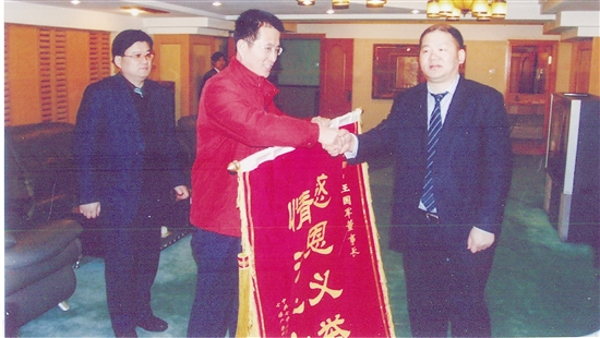 桃山煤矿为王国军(右)颁发锦旗(资料照片)。 受访者供图