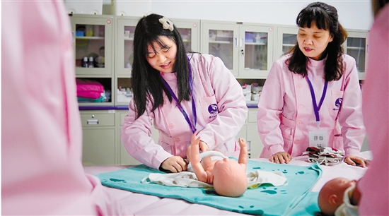在衢州保姆学院训练营,陈希和学员一起练习实操手法。