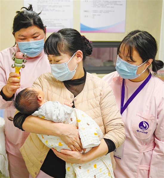 在医院实习期间,陈希(图右)向优秀的保育员取经。