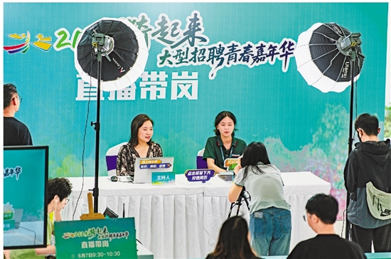 6月7日,2025金华市金东区大型招聘青春嘉年华启幕,239家企业携5117个岗位招聘,吸引万余求职者前来应聘。图为现场开展的直播带岗活动。 通讯员 胡肖飞 摄