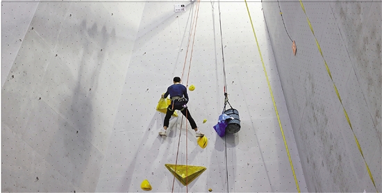 攀石赛的主定线员高雄在攀爬试线。 本报记者 祝旖波 摄