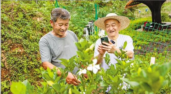 在下姜村栀子花基地,俞旭平(右)用手机记录栀子花盛开。 本报记者 曹坚 通讯员 马丁 摄