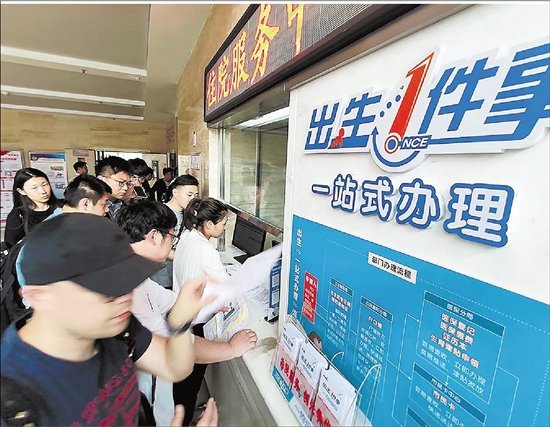 杭州市富阳区妇幼保健院,市民排队办理“新生儿出生一件事”。