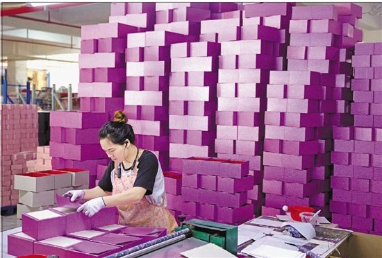 工厂员工各司其职赶制出口礼品盒订单。