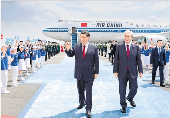 当地时间6月16日中午,国家主席习近平乘专机抵达阿斯塔纳,应哈萨克斯坦共和国总统托卡耶夫邀请,出席第二届中国—中亚峰会。这是习近平向欢迎人群挥手致意。 新华社记者 黄敬文 摄