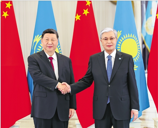 当地时间6月16日下午,哈萨克斯坦总统托卡耶夫同中国国家主席习近平在阿斯塔纳总统府举行会谈。