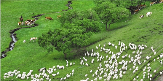 目前,内蒙古赤峰市阿鲁科尔沁旗巴彦温都尔苏木1200余户牧民带领12.8万头(只)牲畜踏上游牧转场之路。2022年5月20日,阿鲁科尔沁草原游牧系统被联合国粮食及农业组织正式认定为全球重要农业文化遗产。图为6月14日,当地牧民在驱赶牧群转场(无人机照片)。 新华社记者 贝赫 摄 |