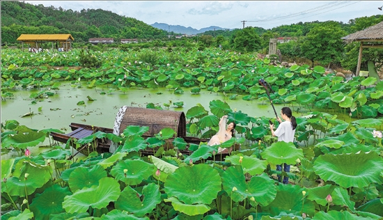 6月16日,金华市婺城区琅琊镇藕遇家庭农场的百亩荷塘里,翠绿的荷叶与粉白的荷花交相映衬,形成一道亮丽的风景线,吸引了众多游客前来游玩打卡。近年来,当地大力发展“荷花经济”,打造集观赏、旅游、采摘于一体的农旅融合特色田园综合体,带动周边村民就业增收。 本报记者 金思成 通讯员 时宽兵 文/摄 |
