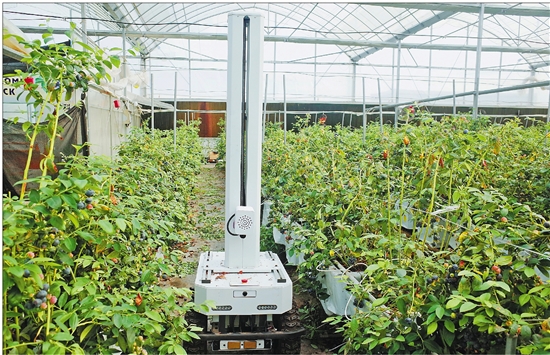 AI机器人正在耘仓数字农场的蓝莓丛中扫描巡检。 本报记者 张熙锦 摄