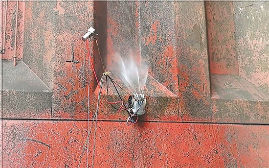 第三代船舶货舱清洗爬壁机器人作业现场。 受访单位供图