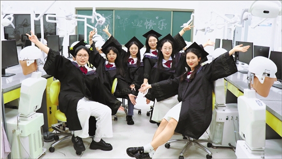 浙江中医药大学2025届口腔医学专业毕业生在口腔技能训练实验室合影留念。