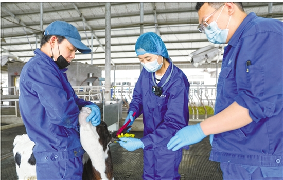 记者(中)在给小牛犊打耳标。 本报记者 王啸天 摄