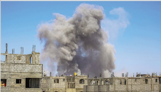 当地时间6月25日,加沙地带中部布赖杰难民营,以色列空袭一座建筑物后,浓烟升起。