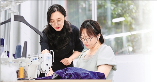 浙江纺织服装职业技术学院时装学院副院长王薇薇指导记者(右)缝制礼服。