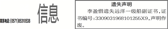 李盈惜遗失远洋一级船副证书,证书编号:3309031968101255X9,声明作废。