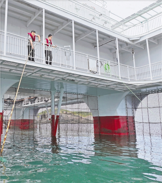 记者(左)在养殖平台打捞离群的大黄鱼。 本报记者 贺元凯 摄