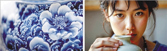 左右图均为AI创作者罗翀用“可灵”等工具,制作的AI非遗文化主题片《瓷韵》的截图。 受访者供图