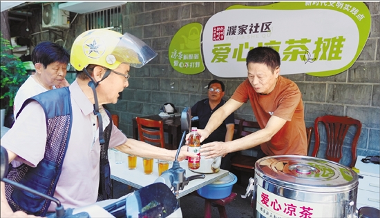 图为7月1日,市民在杭州濮家社区爱心凉茶摊前喝凉茶。