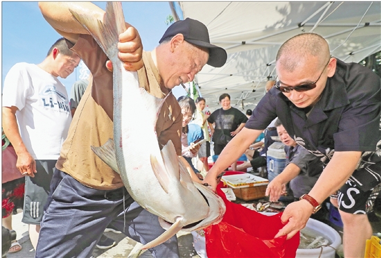 ◁ 图为7月1日,江鲜鱼市上,各类江鲜吸引了众多市民前来购买。