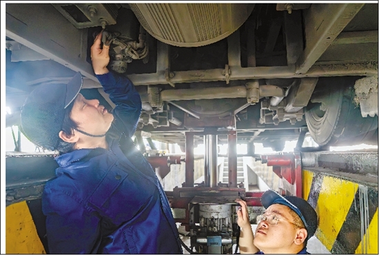 金华市公交集团有限公司在能级工资体系中设立了带徒津贴。图为公司技能人才蒋根留(左)给徒弟讲解维修要点。 共享联盟·金华 陈业 摄