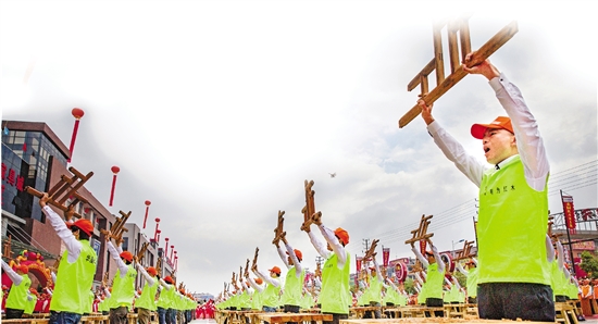 东阳红木行业在金华较早开展能级工资集体协商。图为花园红木文化节上,工匠同台展示技能。 通讯员 王江红 摄
