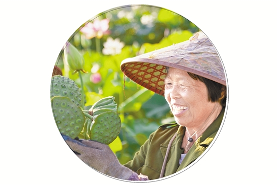 龙游县“荷田田”共富工坊莲农正在采摘莲蓬