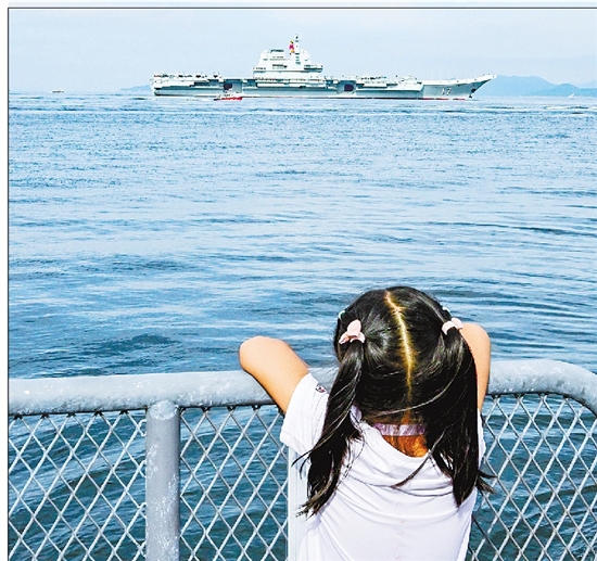 7月3日,一名儿童在岸上观看海军山东舰抵达香港。 新华社记者 朱炜 摄