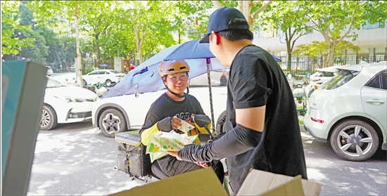 辛利君(右)从“爱心冰箱”取出棒冰,递给外卖骑手。 见习记者 周文成 摄
